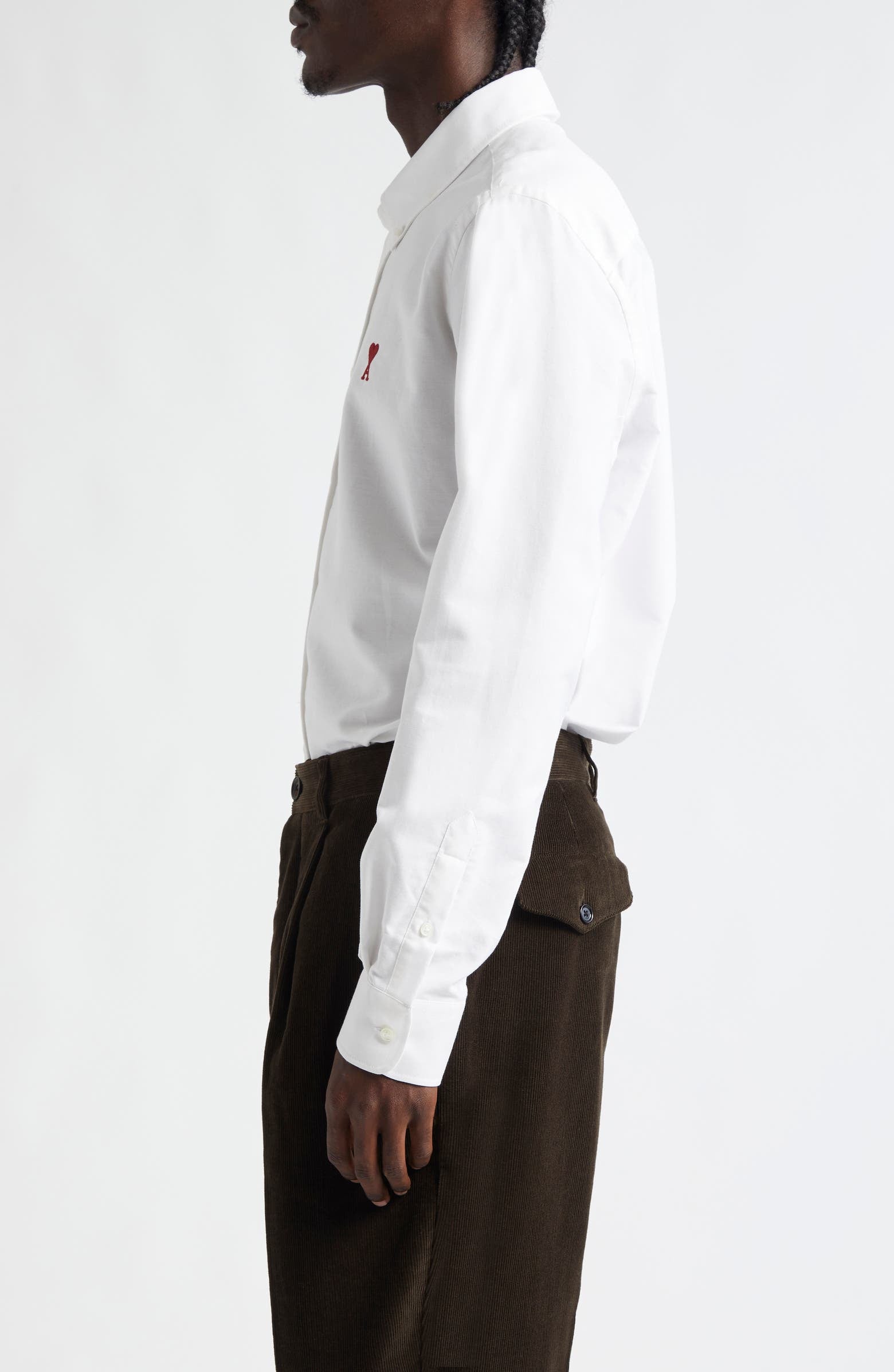 Ace-of-hearts chain-stitch embroidery—a play on founder Alexandre Mattiussi's monogram—deals a winning look to this button-down shirt cut from cotton oxford.