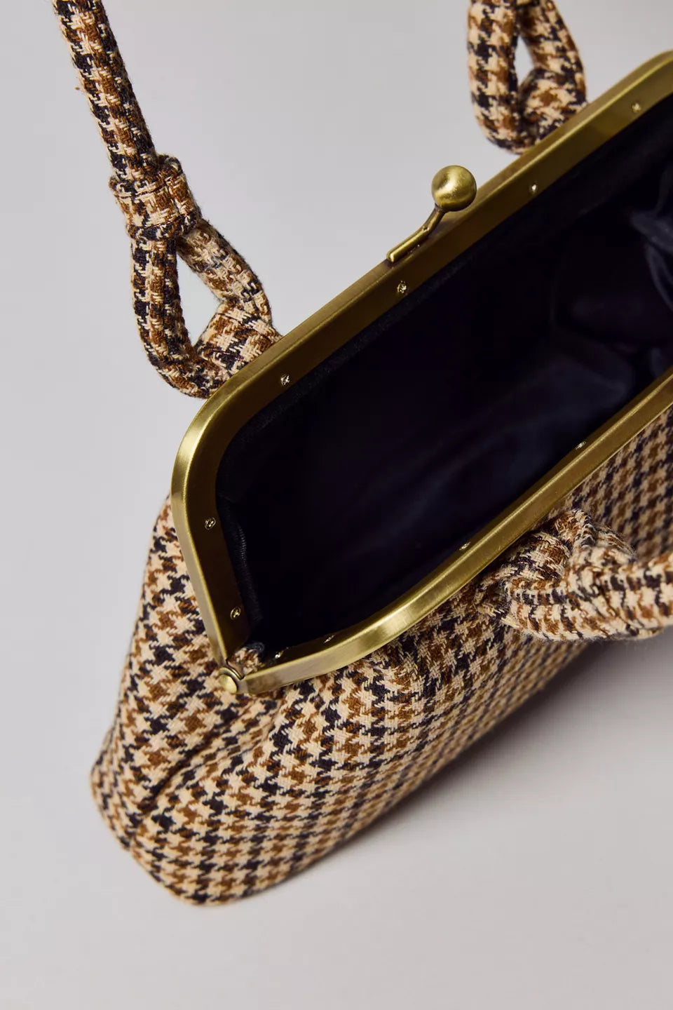 Inspired by vintage bags, this structured mini bag is topped with an allover houndstooth plaid pattern. Small plaid bag with a gold-tone metal frame and kisslock closure. From Kimchi Blue and only at Urban Outfitters.