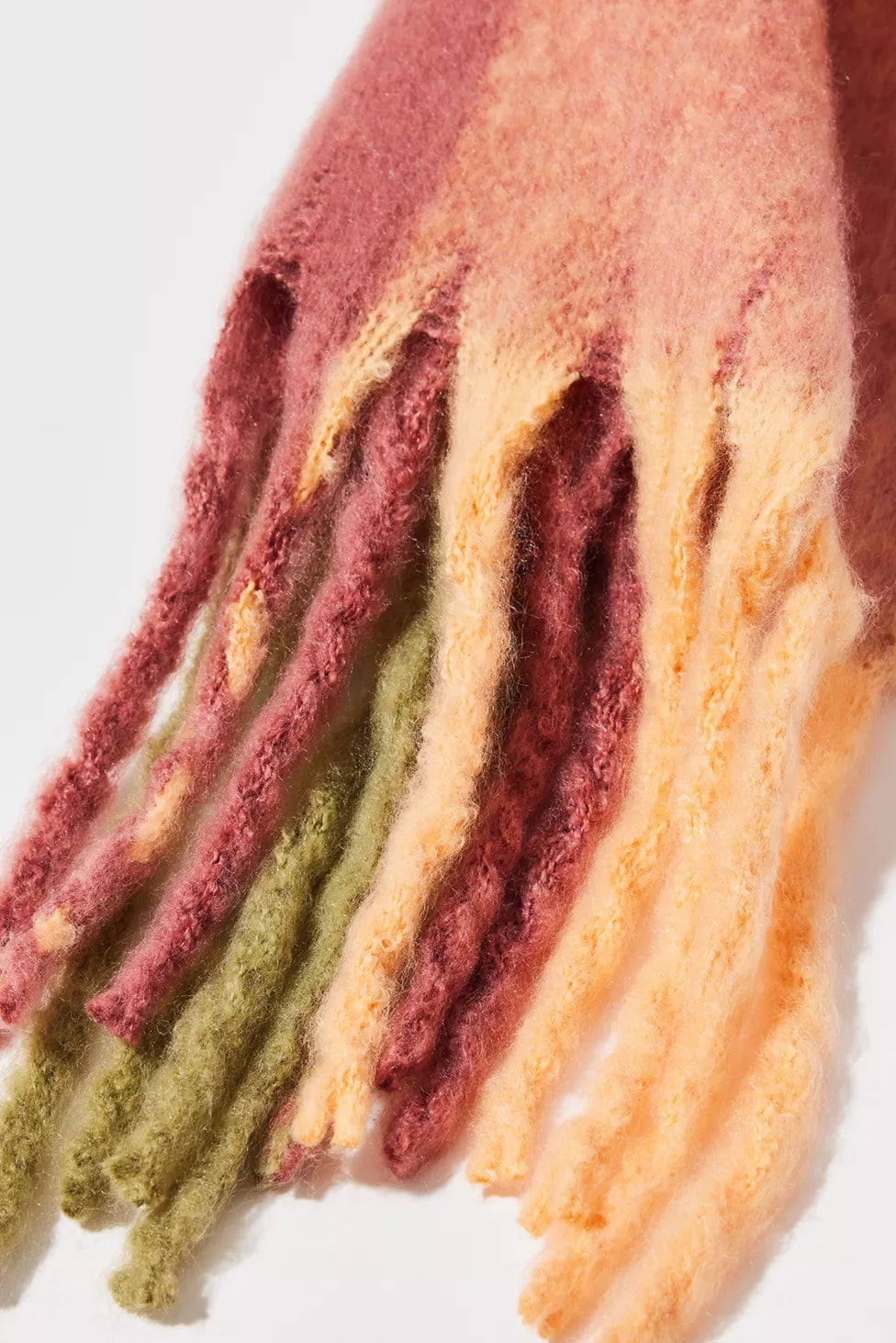 Ultra-cozy oversized scarf with a brushed plaid pattern and fringe ends. Long scarf silhouette that's perfect for wrapping up in all season long.