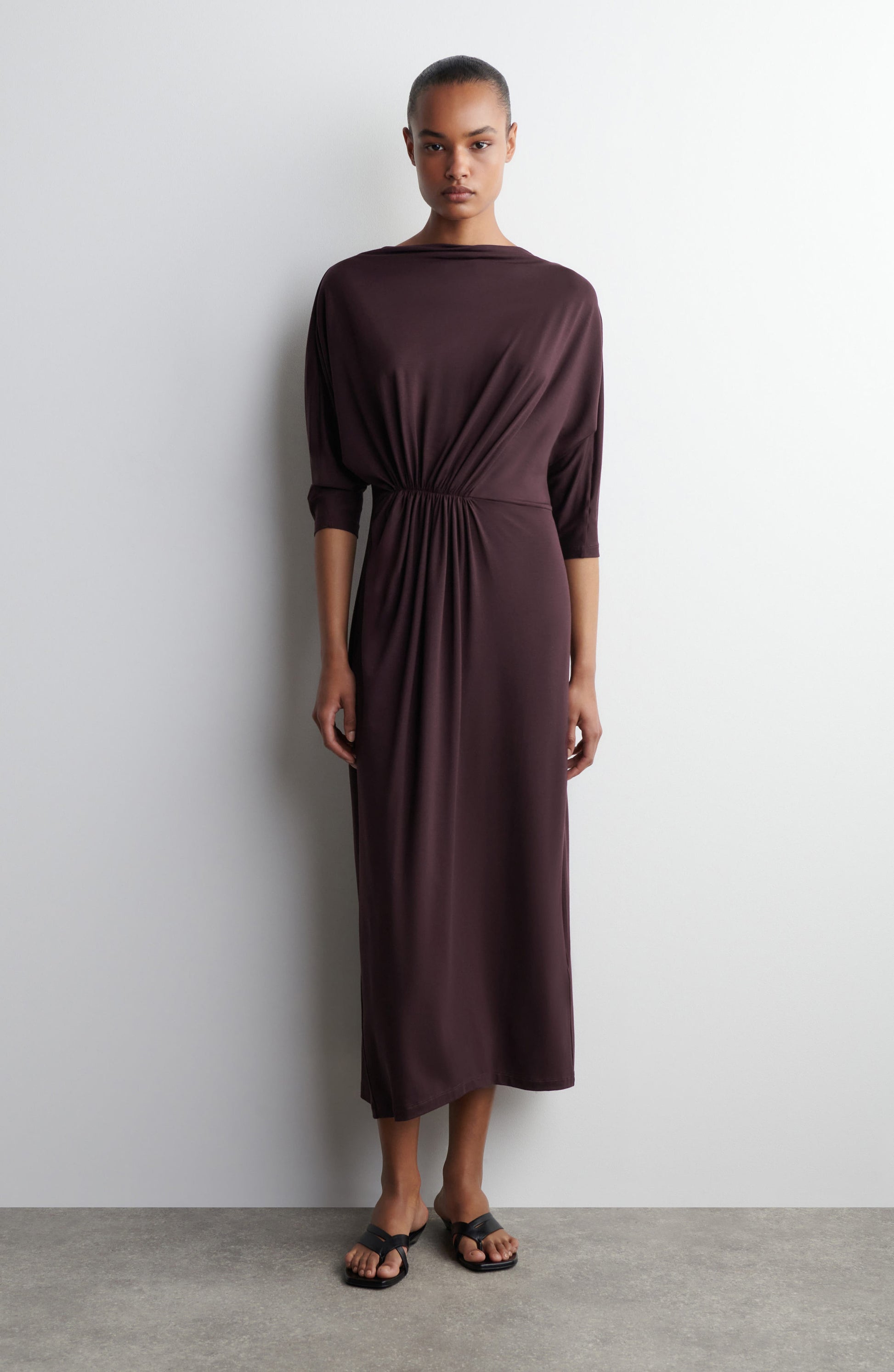 Artful gathers along the waistline and cowl neck shape the silhouette of this minimalist midi dress cut from fluidly flowing fabric.