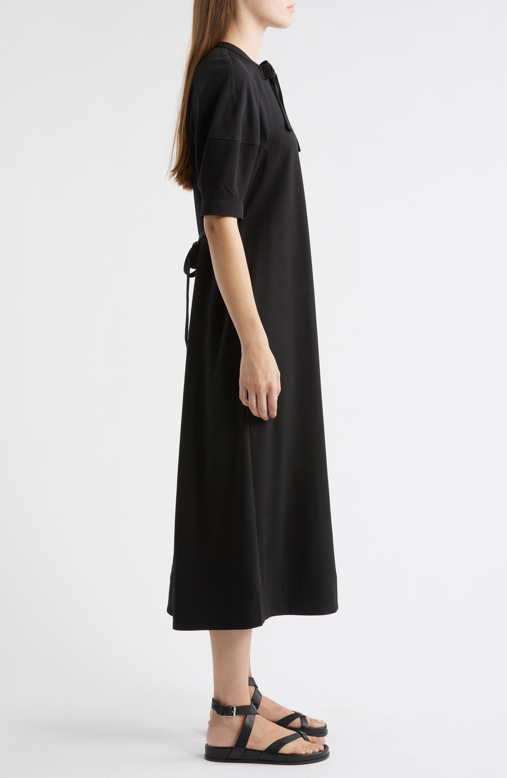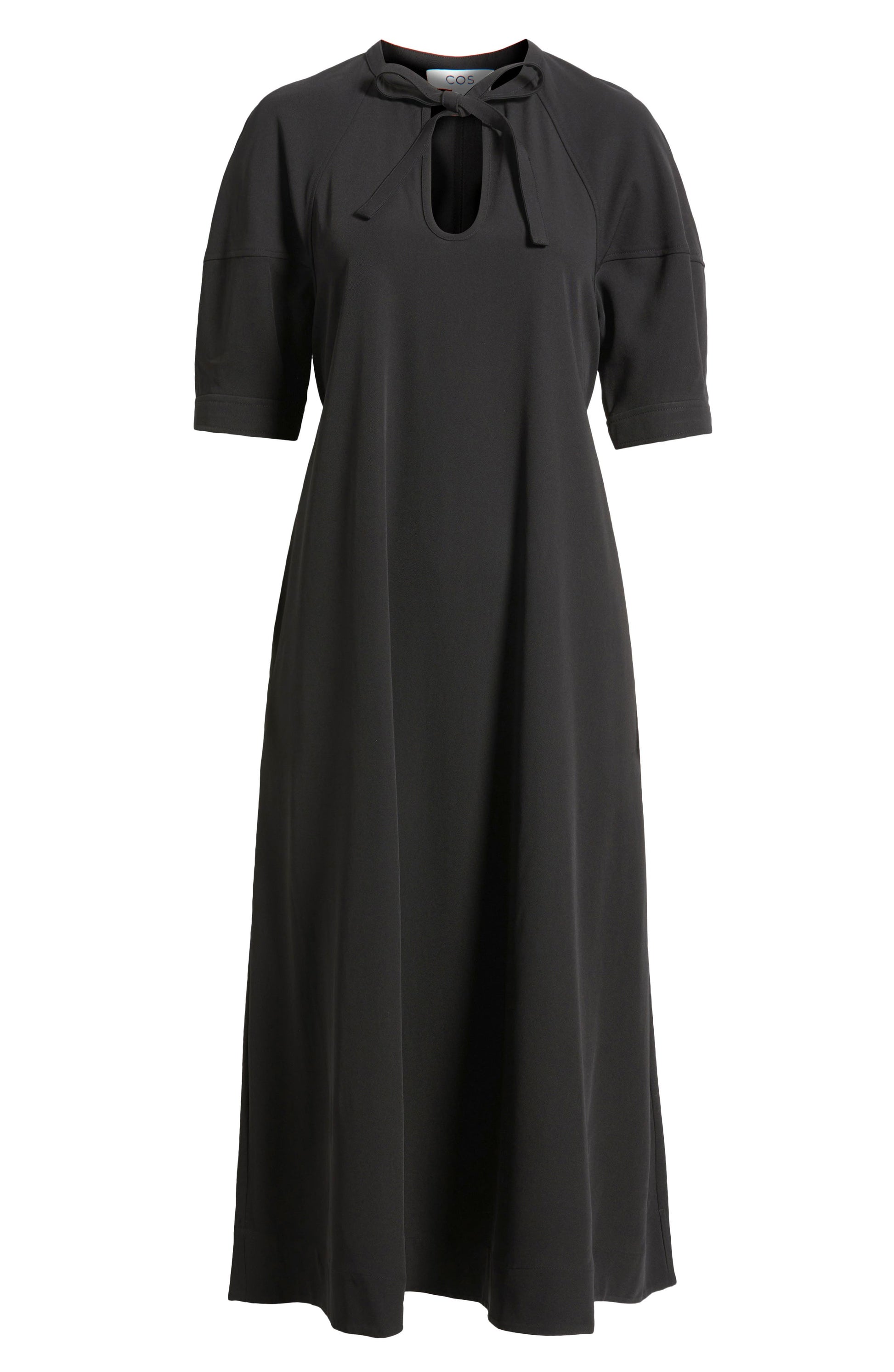 Elbow-length raglan sleeves give structure to this tie-neck midi finished with a flared skirt that sways with every step.